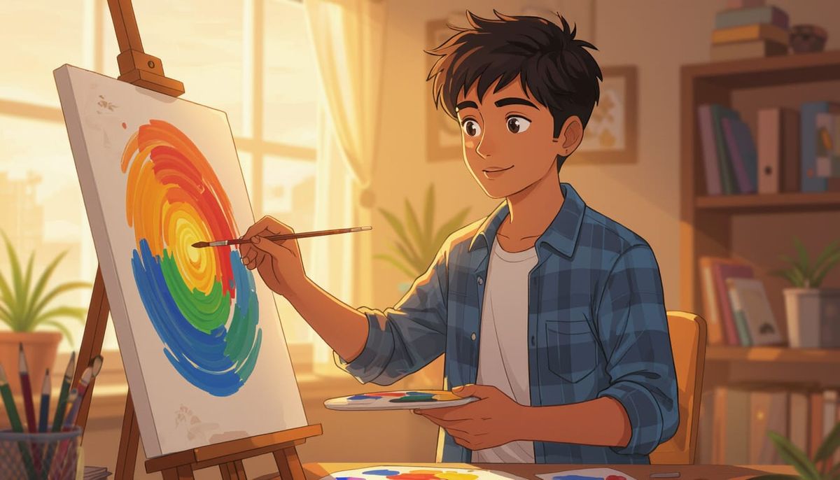 This image shows a thoughtful young Indian man beginning to paint on a blank canvas. Rendered in a charming cartoon style with rich colors and intricate details, it evokes anime aesthetics.