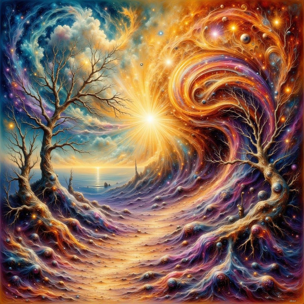 This image shows a sandy beach rolling up into a corkscrew shape against a purple and red sky. Golden dust swirls, moody creatures, and oddly bending trees add to the otherworldly, abstract reality.
