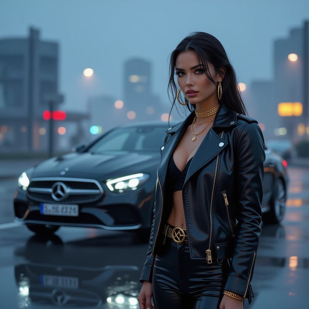 A striking picture of a woman in a black leather jacket standing beside a 2025 Mercedes-Benz E-Class. The image features atmospheric lighting and a vibrant color palette, in a futuristic style.
