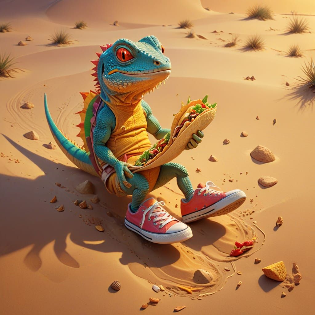 This vibrant digital painting shows a cartoonish lizard wearing colorful sneakers, energetically carrying tacos across golden dunes under a warm sunset and moonlit sky. Detailed and fantastical.
