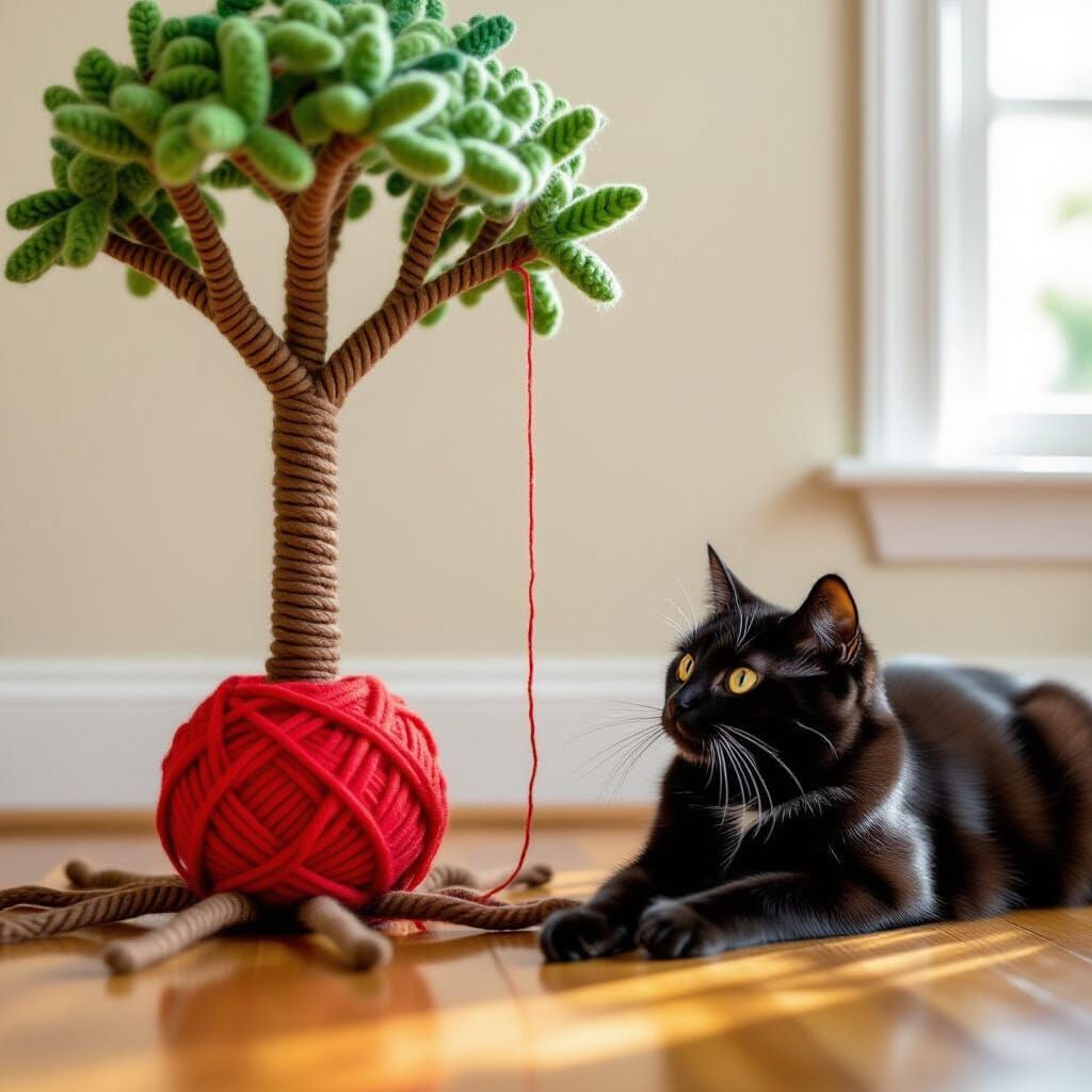 This image shows a black cat resting near a whimsical yarn tree. The tree features a spherical yarn ball base, delicate roots, slender branches with knitted leaves, and a thread connecting to the cat. Rendered with sharp focus, crisp details, and high contrast lighting.