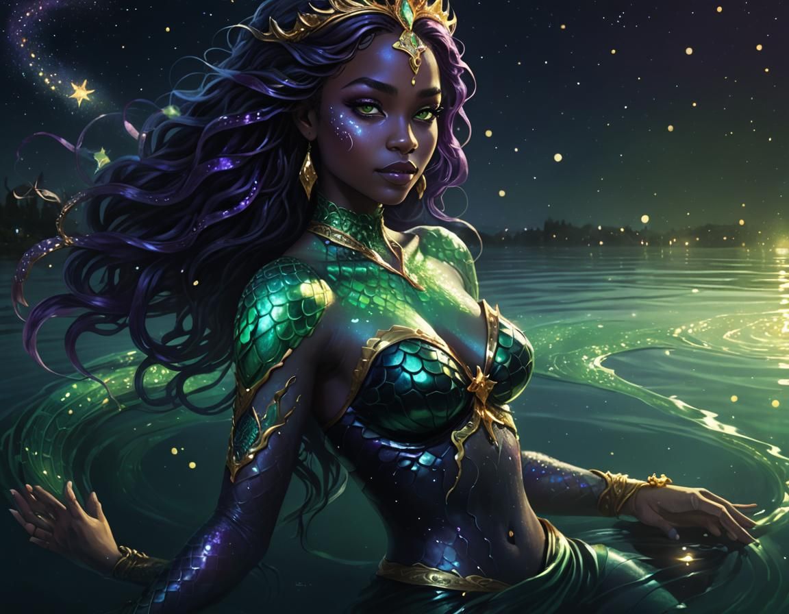 A striking picture of a dark mermaid djinn queen in a tranquil star-filled lake. This vibrant digital painting features glowing green eyes, an iridescent tail, and soft water ripples in blue and purple hues with golden lighting.