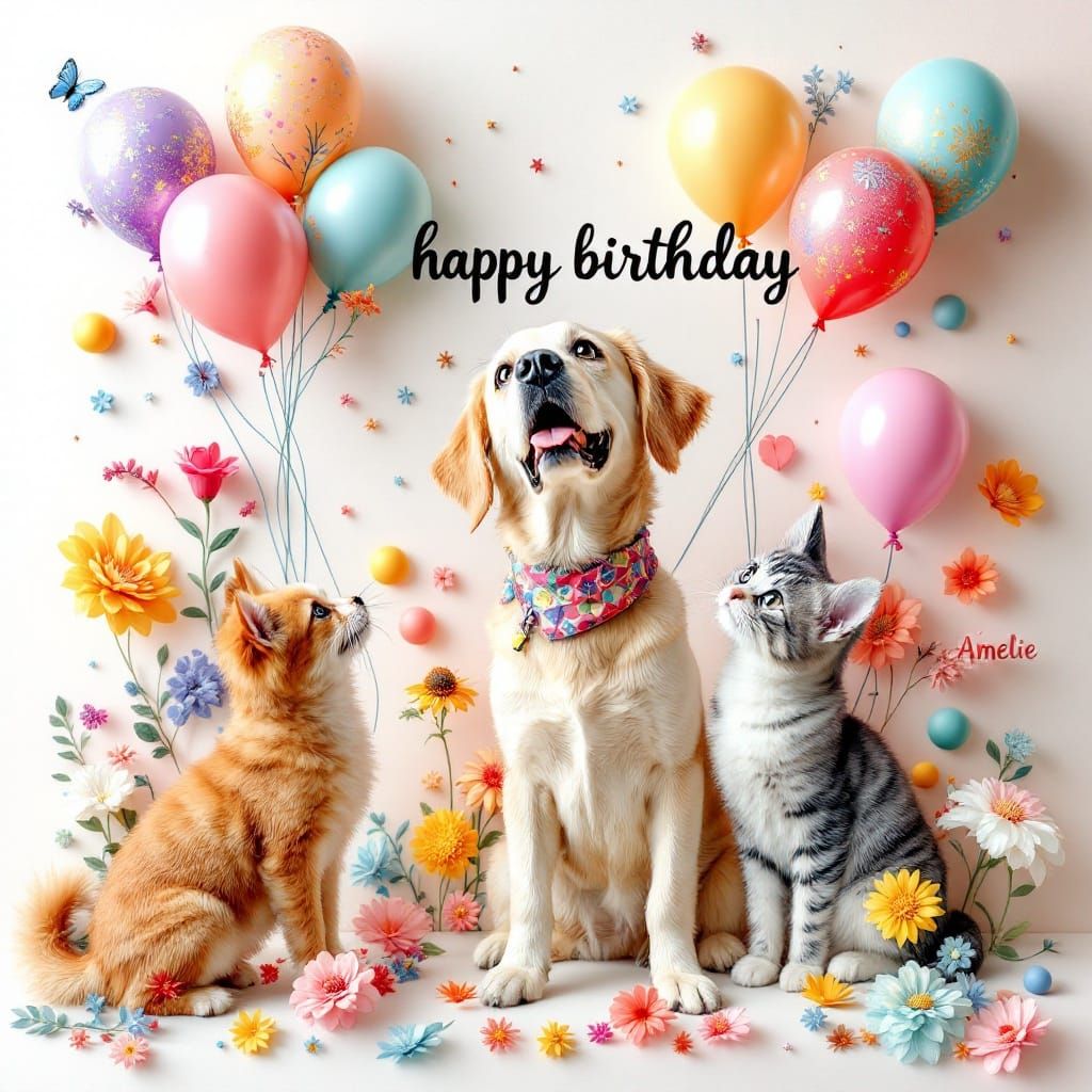 This image shows a colorful 3D scene featuring balloons, flowers, a dog, and a cat, all celebrating a birthday in a lively and playful atmosphere.