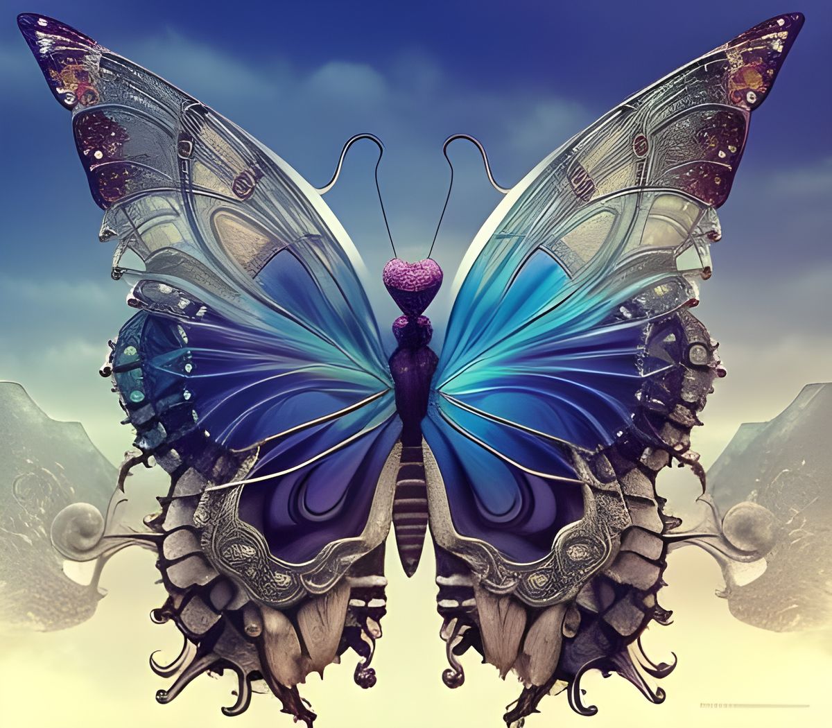 A digital painting of a clockwork butterfly with crystal wings. The artwork features dramatic lighting, intricate details, and a vibrant color palette, rendered in a maximalist style.