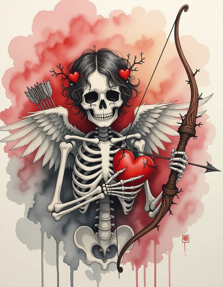 This image showcases a skeletal Cupid in a loose watercolor style, with hollow eyes and thorny hearts. Dark, haunting splashes surround the figure, illuminated by moody chiaroscuro lighting.