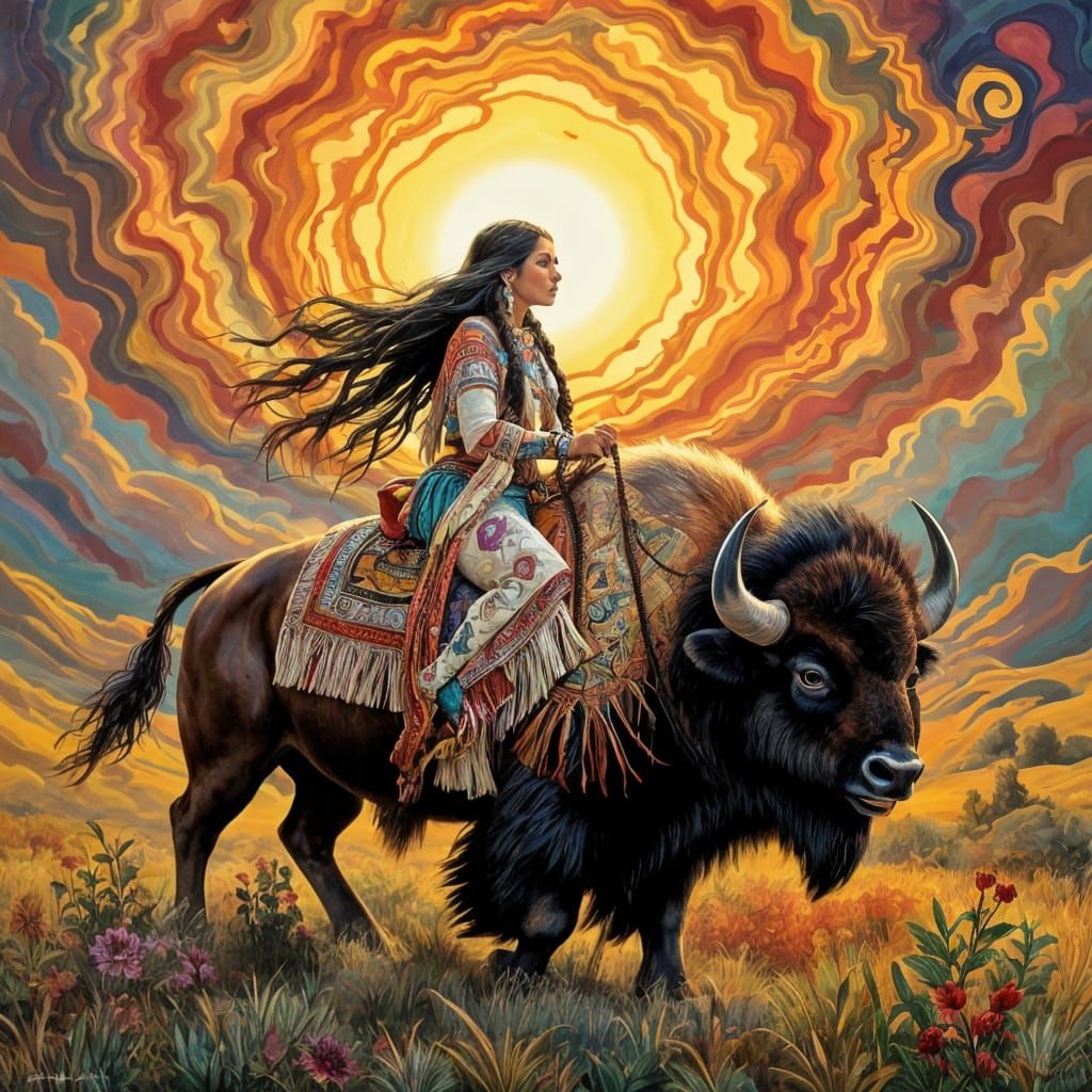A striking picture of a Native American woman riding a buffalo across a surreal, psychedelic landscape. The image is rendered with bold, vibrant colors and intricate details in a psychedelic surrealist style.