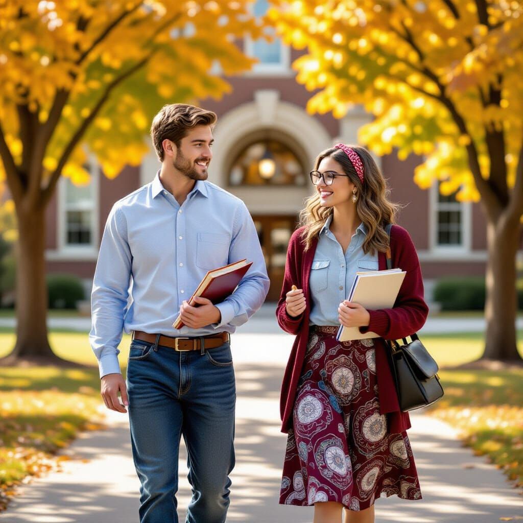 This image shows two college students walking on campus in autumn. The scene blends warmth, detailed realism, and a focus on everyday life reminiscent of classic American illustration.