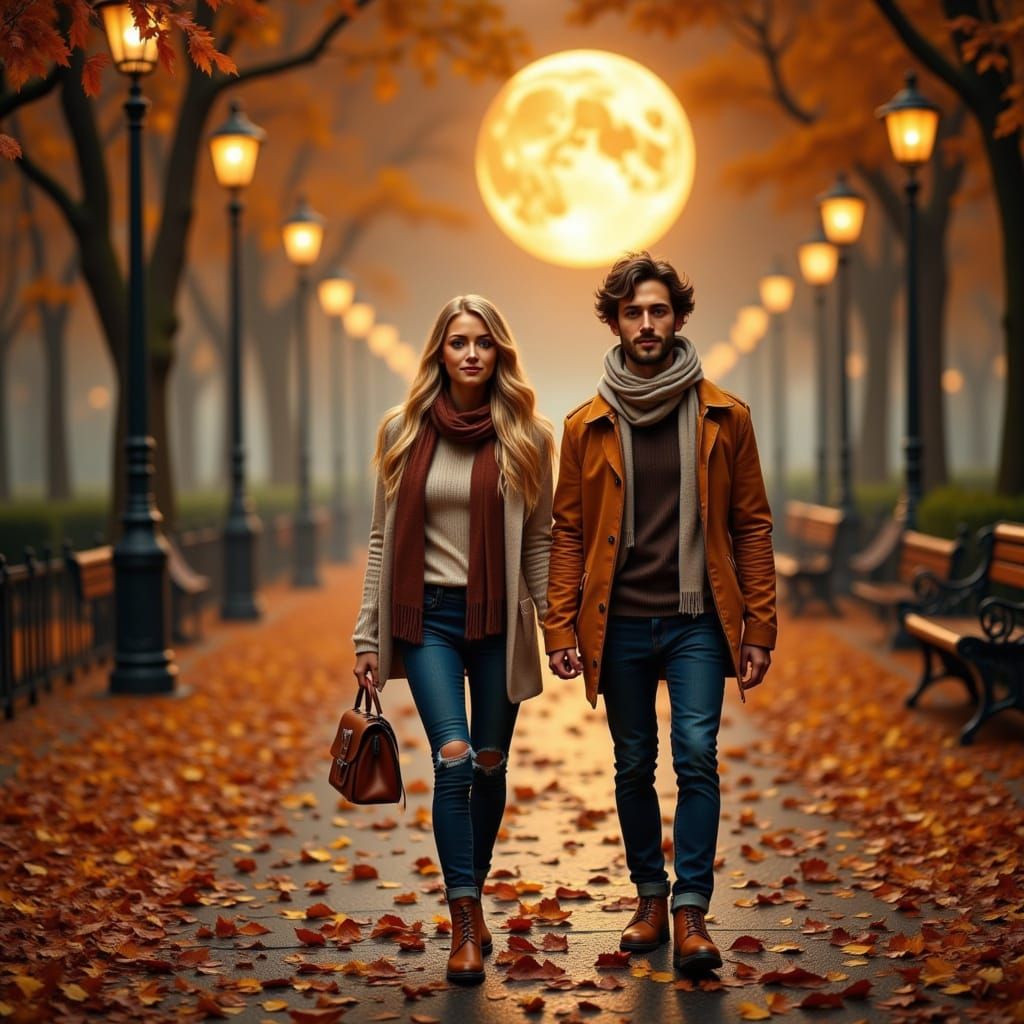 This image shows Abbie and André enjoying a romantic autumn evening walk. They stroll hand-in-hand through a Parisian park, illuminated by street lamps and a harvest moon, in an impressionistic style.