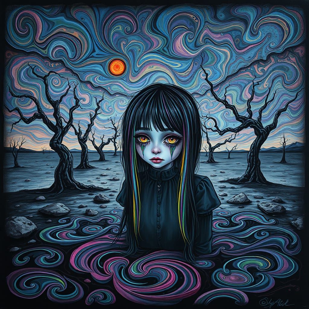 A haunting image of a melancholic goth girl surrounded by a surreal, dreamlike environment with twisted trees and vibrant colors, reminiscent of Salvador Dali's surrealist style and Tim Burton's dark whimsy.