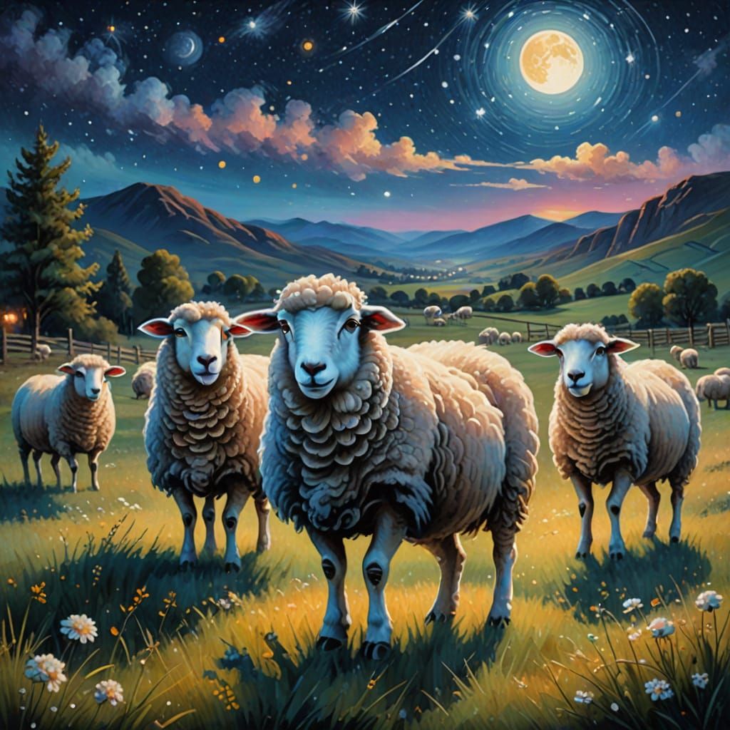 A striking picture of an adorable sheep in a moonlit landscape. Rendered as an impressionistic oil painting, it features soft pastel colors, gentle brushstrokes, and twinkling starlight effects to create a magical realism style.