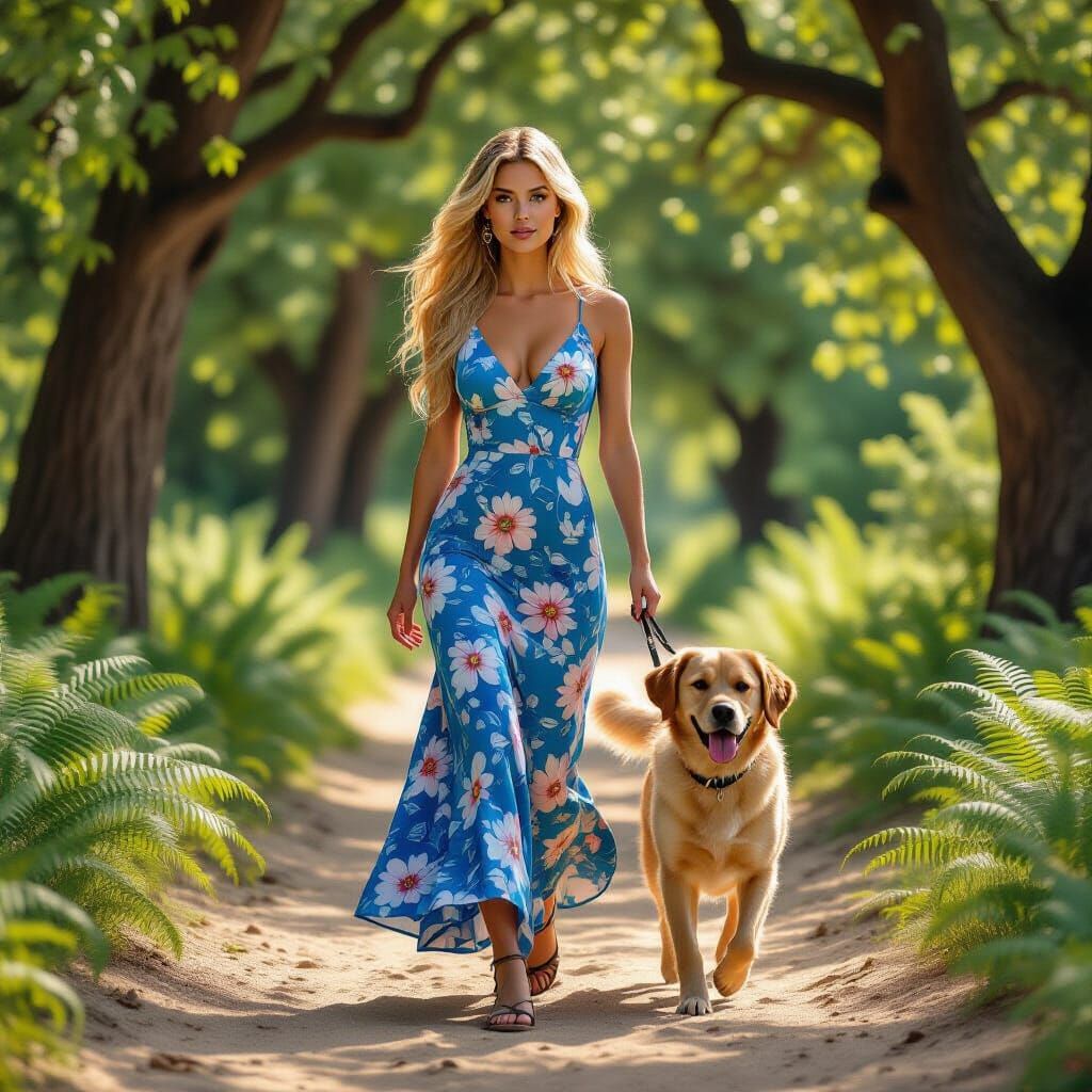 A realistic image of a woman walking her dog in a forest. The woman has long blonde hair and is wearing a blue floral dress. The image is rich with detail and color.