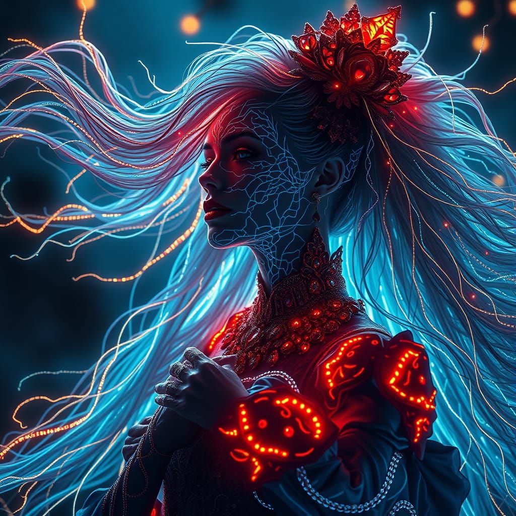 This image shows a woman with long hair made of glowing electric veins. She wears an ornate costume against a dark backdrop in a digital matte painting style.