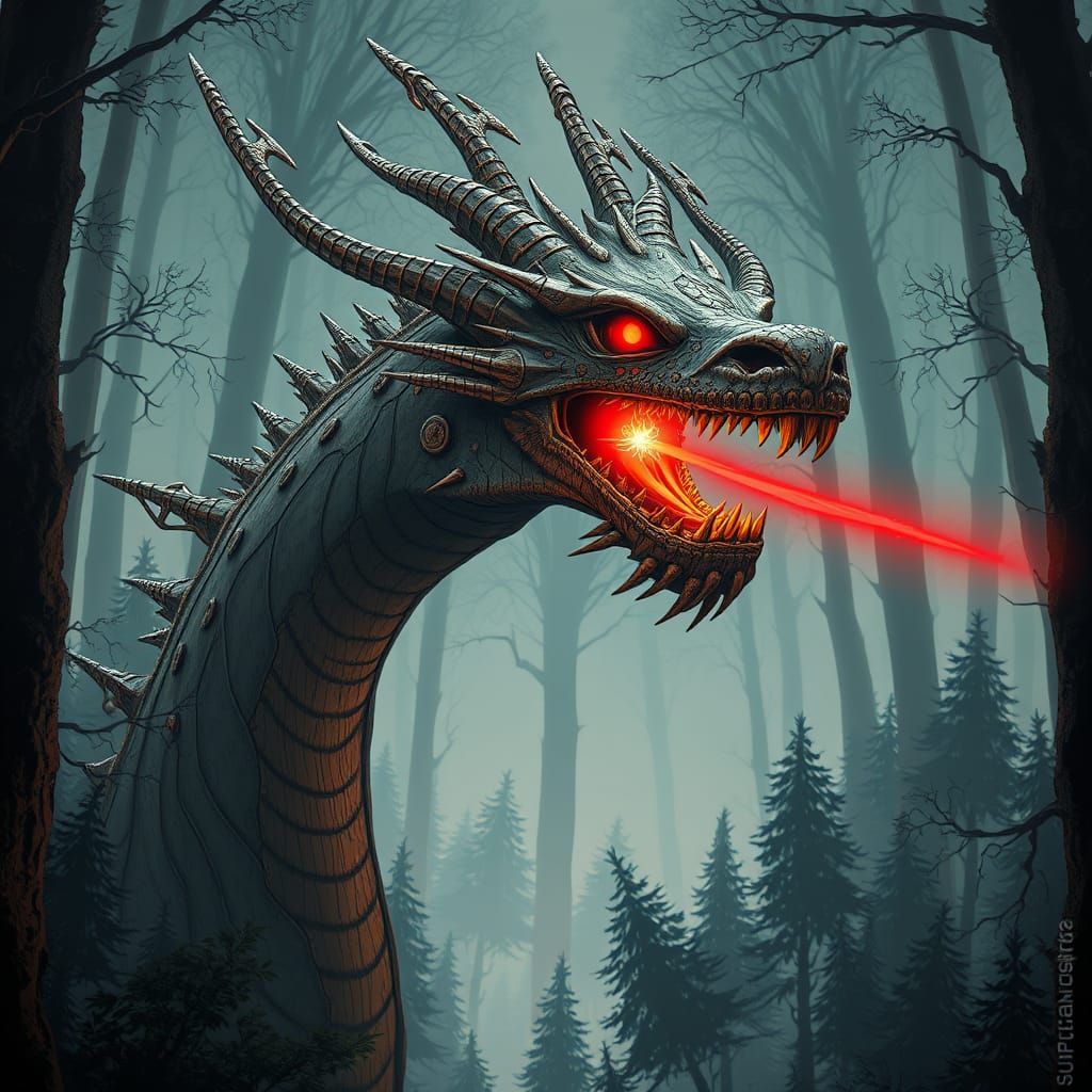 This image depicts a majestic dragon in a detailed woodcut style, with long fiery horns and intricately carved scales featuring futuristic symbols. Its eyes glow like rubies, and its open mouth radiates intense red light amidst a lush, dark forest reminiscent of Gothic fantasy landscapes.