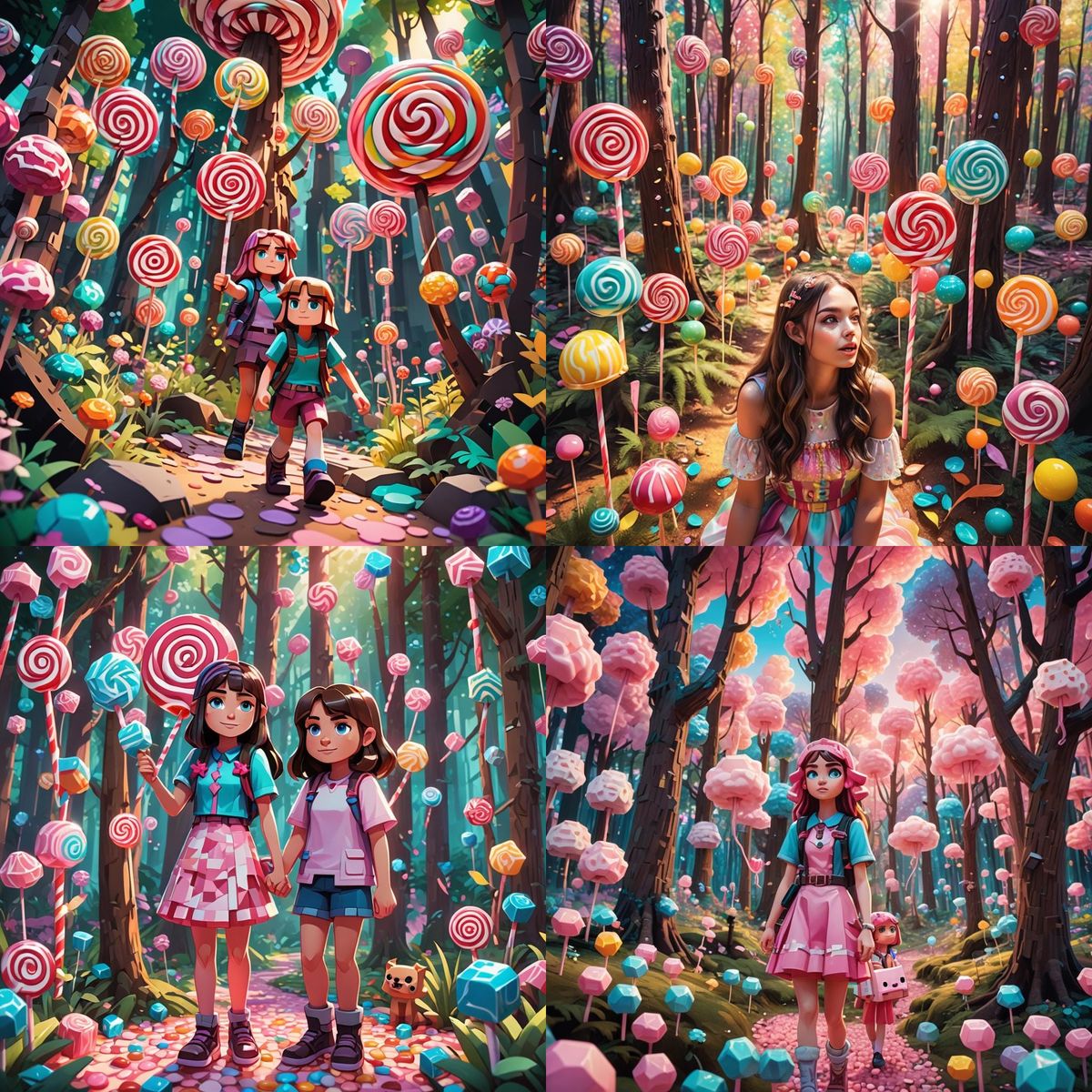 A digital illustration of Alex and Steve from Minecraft in a forest setting. The artwork is rendered in a whimsical and colorful candy art style, reminiscent of a vibrant Candyland.