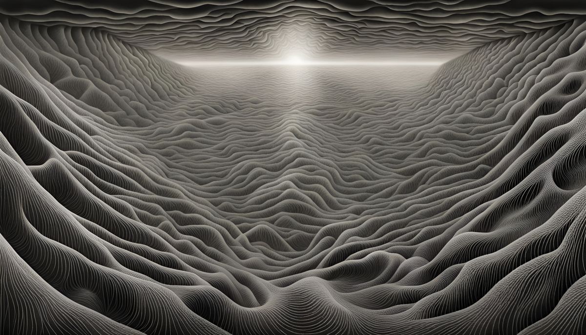 This image depicts a complex fractal landscape of interconnected neural pathways. The hyperdetailed charcoal drawing uses thin lines to create a vision of a futuristic universe.