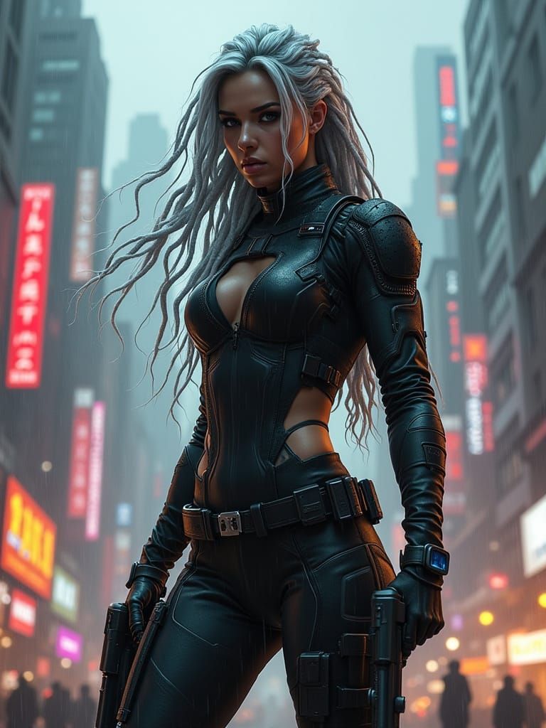 This image shows a female operative in a rain-soaked cyberpunk city. She wears a tactical bodysuit and dreadlocks, surrounded by neon signs and alien technology. A rebel stronghold pulses nearby, rendered in a hyperrealistic style.