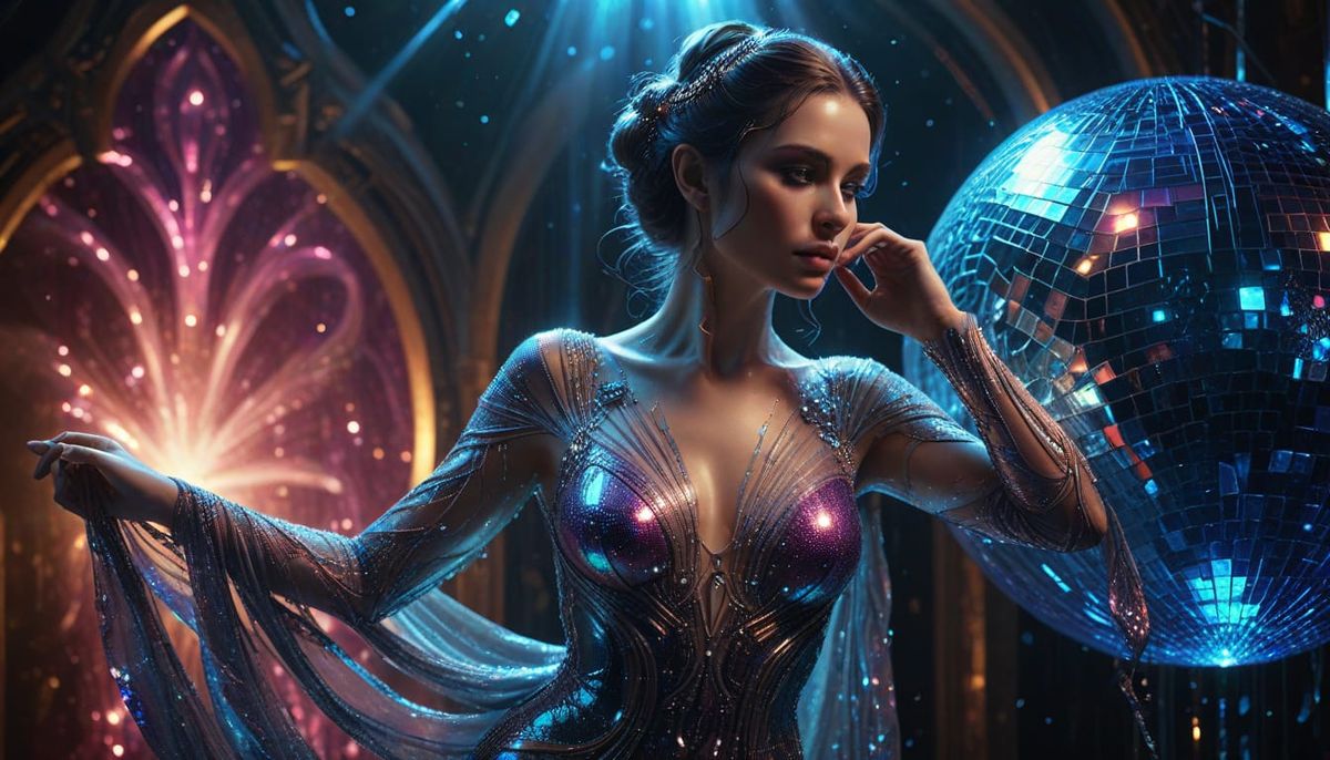 This image showcases a stunning digital portrait of a woman in a lavish, long flowing gown covered in sparkling sequins, set against a backdrop of a glittering disco ball and opulent lighting, reminiscent of Art Nouveau and high-fashion photography.