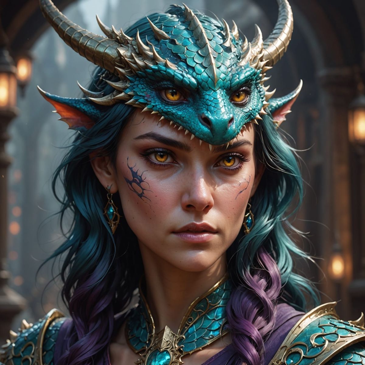 This image is a high-resolution concept art portrait of a female dragon humanoid, set against a backdrop of dramatic lighting and vibrant triadic colors. The intricate details and dynamic lighting create a captivating and unsettling atmosphere, characteristic of modern horror art.