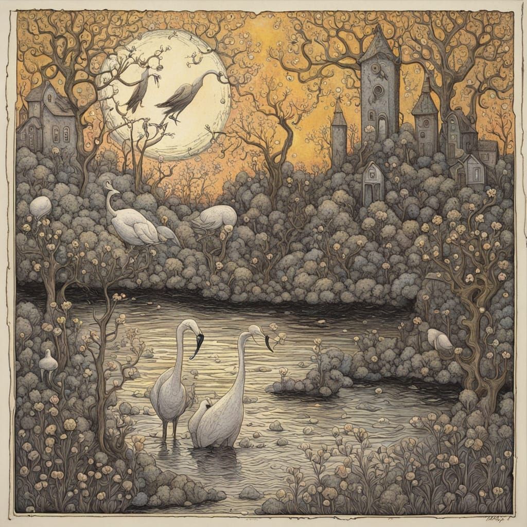 A surreal landscape with the earth meeting a lake, abundant with yellow pears and wild roses. Swans drink from the waters in this intricately detailed, entangled scene, reminiscent of Mike Mignola and Andy Kehoe's style.