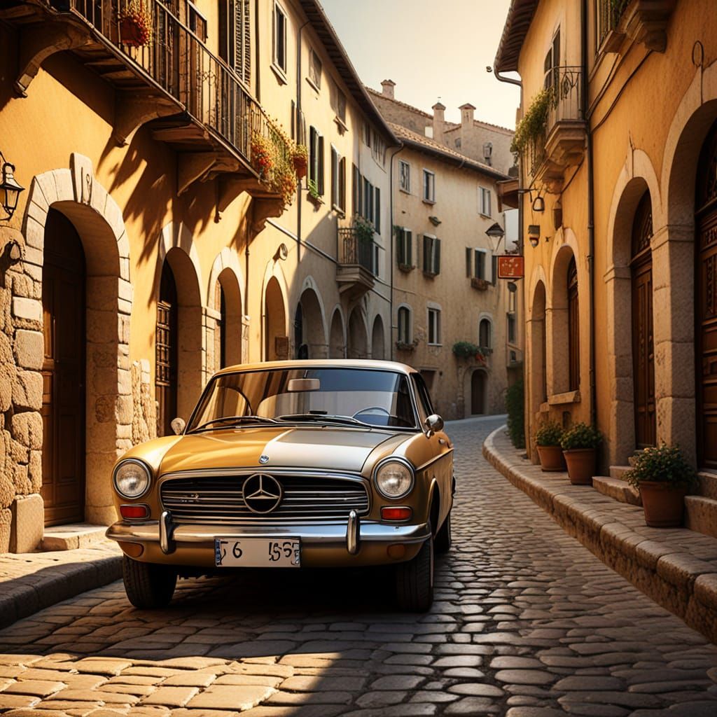 This image shows a vintage car on a cobblestone street in a medieval Italian town. Golden light reflects off chrome details, with soft shadows and vivid textures in photorealistic digital art.