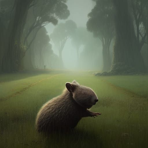 A striking picture of a wombat in a field, its green eyes piercing the viewer. The image is a detailed dark fantasy concept art with dynamic and volumetric lighting.