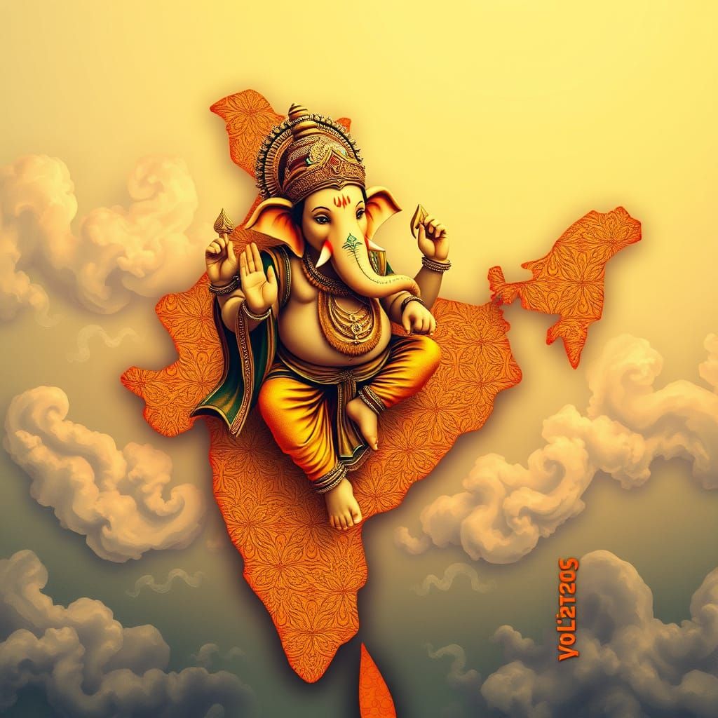 This beautiful image depicts Ganesha, the revered Hindu deity, majestically hovering above a stylized map of India, adorned with intricate henna patterns and swirling clouds, rendered in a warm, golden light with delicate textures, blending traditional Indian attire with dreamy landscapes and symbolic de...