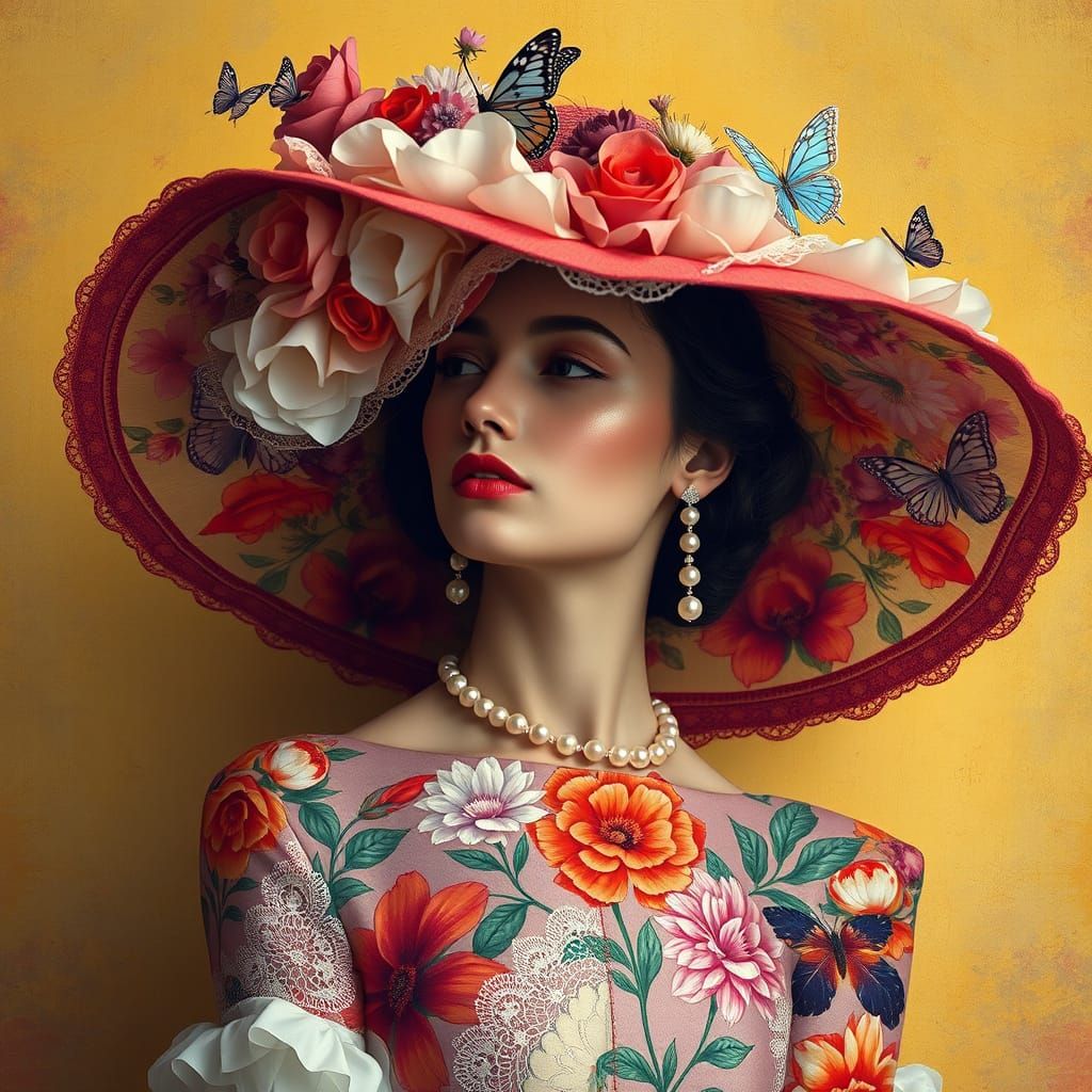 jolie femme élégante en tenue moulante florale (rouge, orange, violet, vert), chapeau large avec fleur, papillon, résille. Boucles d’oreilles en perles, pose sereine, fond jaune texturé. Style : haute couture, art floral, surréalisme poétique. Ultra-réaliste