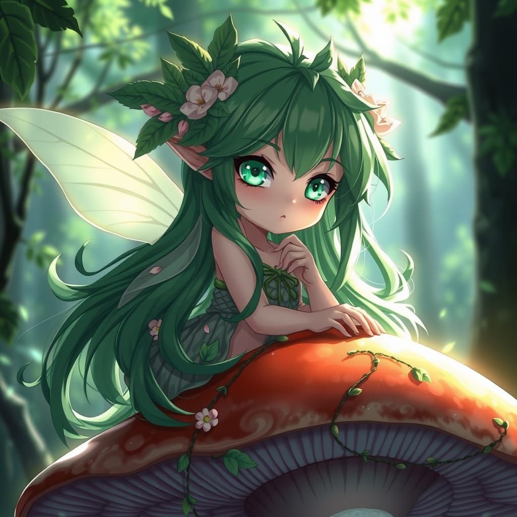 This image shows an anime-style forest spirit with flowing green hair and emerald eyes, perched on a mushroom. Dappled shadows, pale skin, and a gown of vines create an ethereal aesthetic.