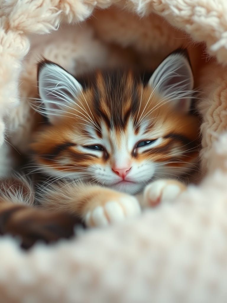 A charming image of a kitten curled up comfortably. The kitten has fluffy fur and bright eyes and is purring contentedly. The image is reminiscent of soft focus painting with delicate textures.