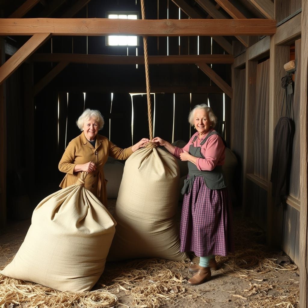 This image shows two mature women in a rustic barn tying large vintage sacks with rope. The scene evokes a sense of traditional farm work and strength.
