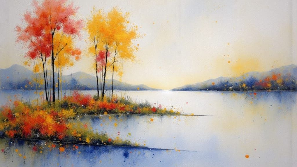 This AI-generated image depicts a stylized, abstract shore across a lake using alcohol ink. It features negative space and a fuzzy, adorable aesthetic.