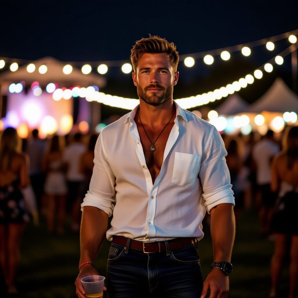 This image shows a man at an outdoor music festival at night. The man is wearing a linen shirt and jeans and holding a plastic cup in a warm, realistic photographic style.