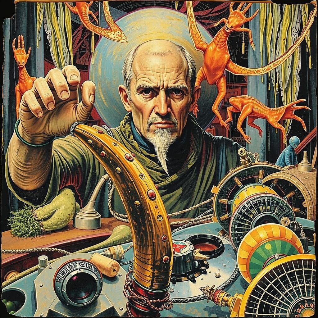 A striking image evocative of vintage science fiction book covers. The artwork features psychedelic and surreal elements, reminiscent of visionary art.