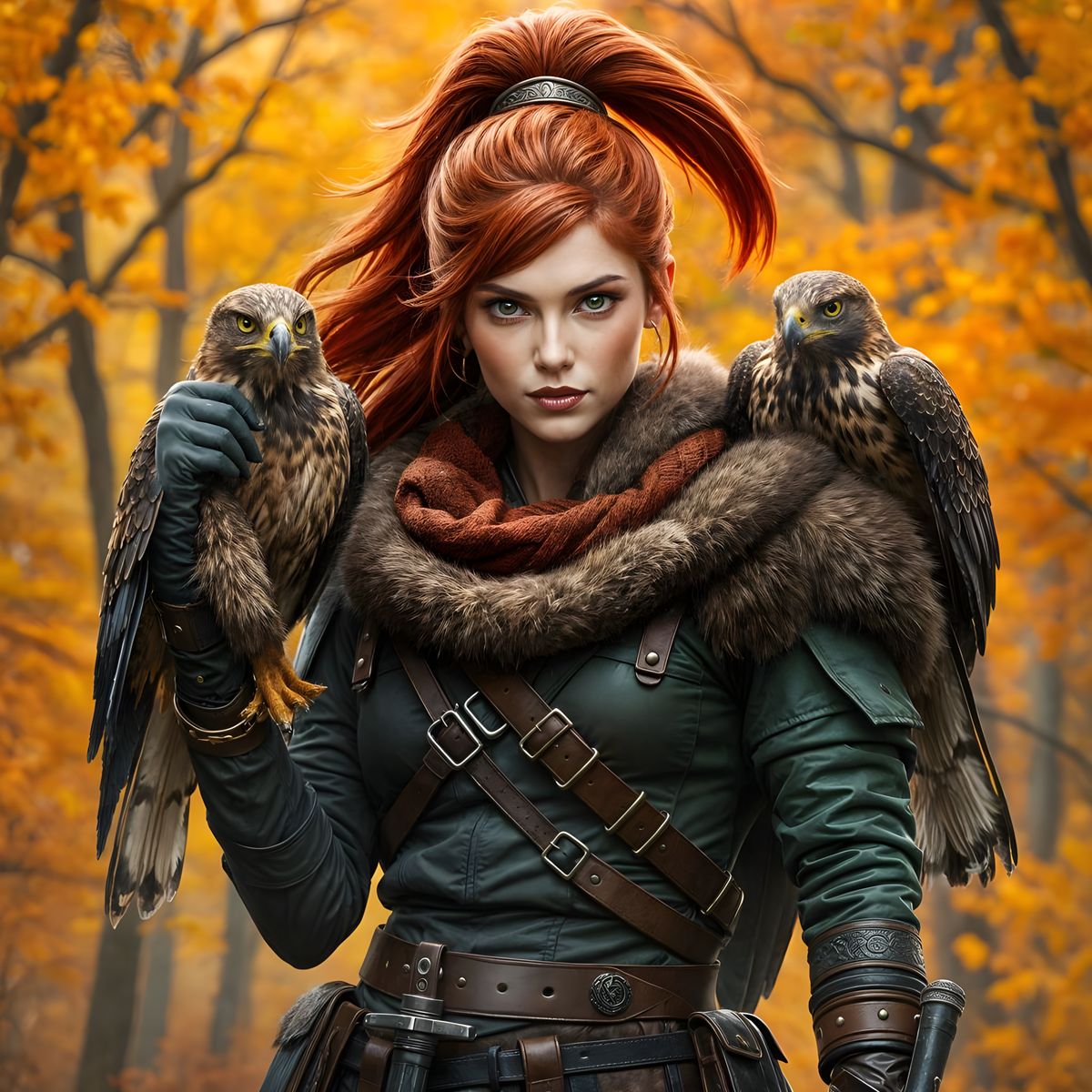 This image depicts a strong female warrior standing in an autumn forest, surrounded by vibrant colors and soft light. She wears a rugged leather outfit with intricate details, holding a majestic hawk on her gloved arm, and exudes a sense of determination and power.
