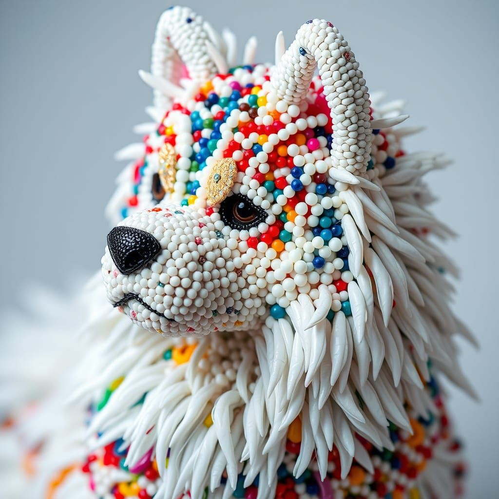 This image shows a Samoyed dog constructed from colorful beads, showcasing intricate details and vibrant textures. The artwork is reminiscent of pop art and surrealist illustration.