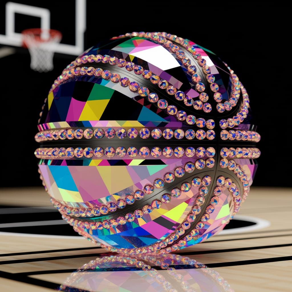 This image shows a crystal basketball with many colors and intricate details. The crystalline basketball is set against a blurred background of a basketball court, as digital art.