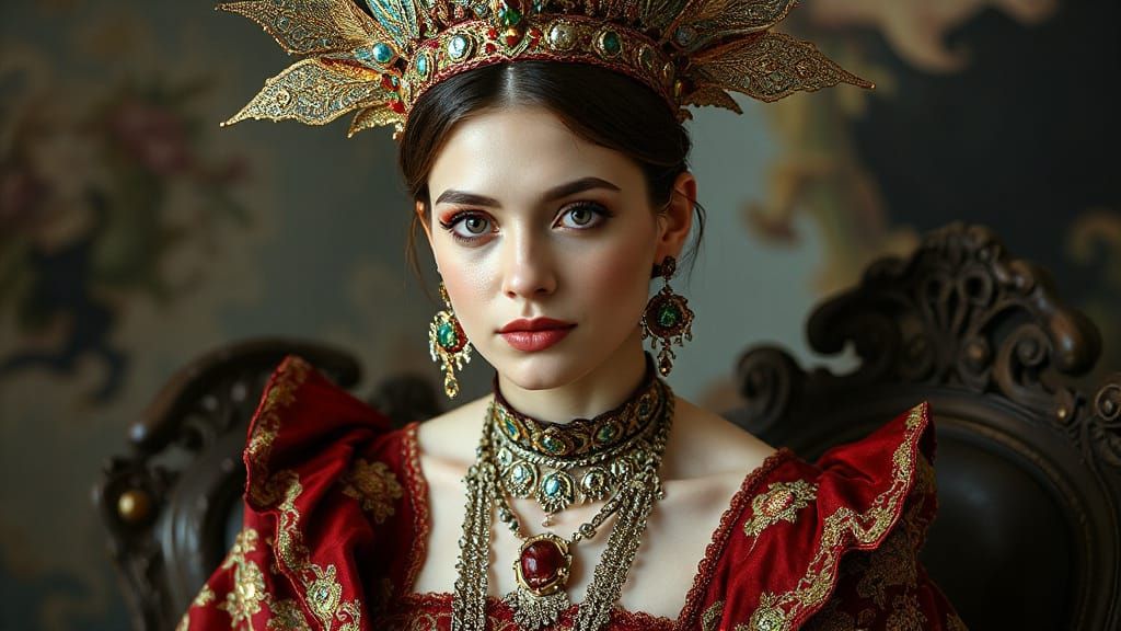 A striking picture of a young woman in elaborate dress. This portrait features bold colors and surreal elements in a neo-fauvist style, with photorealistic details and bright, soft lighting.