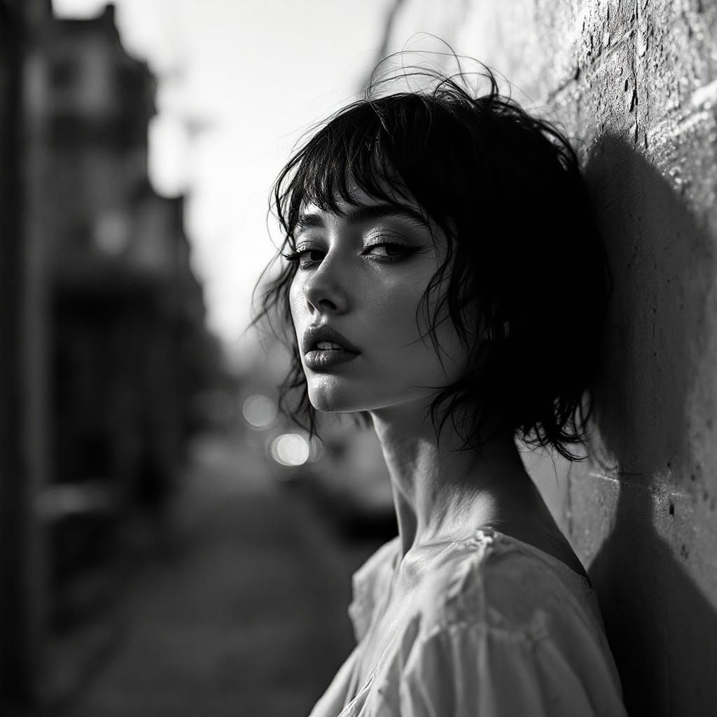 A striking image of a woman walking down a quiet street. The image uses dramatic monochromatic contrast and selective luminosity to create visual tension between decay and refinement.