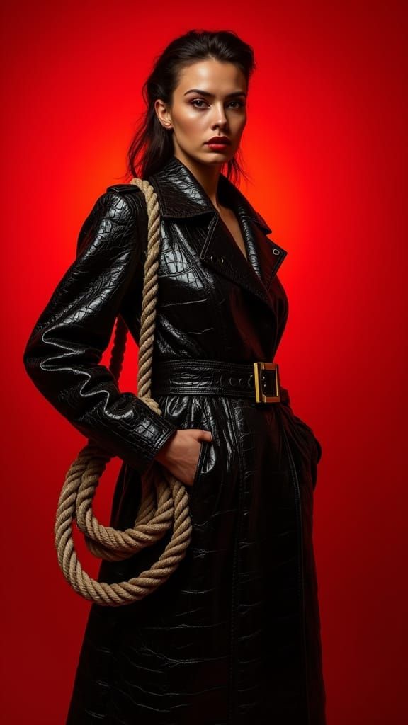 This image shows a confident woman standing tall with elegance, surrounded by a fiery red glow. She wears a luxurious black crocodile leather trench coat and holds a thick nautical rope, exuding strength and precision.