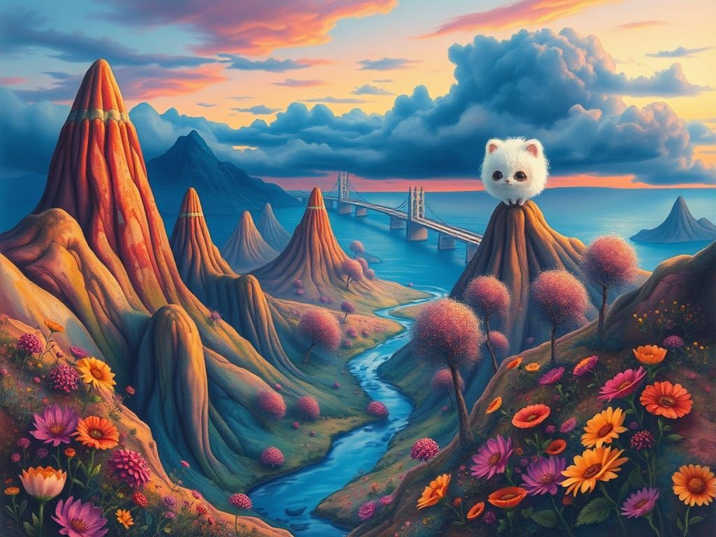This image shows a colorful, surreal landscape with bizarre mountains and alien flora. A fluffy, otherworldly creature stands in the distance, with heart-shaped trees and a river in the sky, rendered as a watercolor.