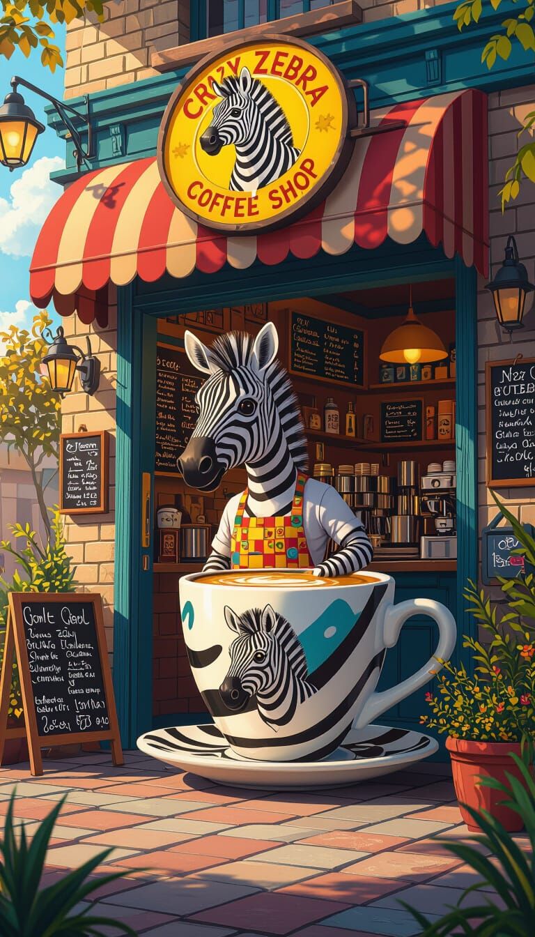 Create your own crazy zebra coffee shop images with our free AI image generator. It's easy and fun!