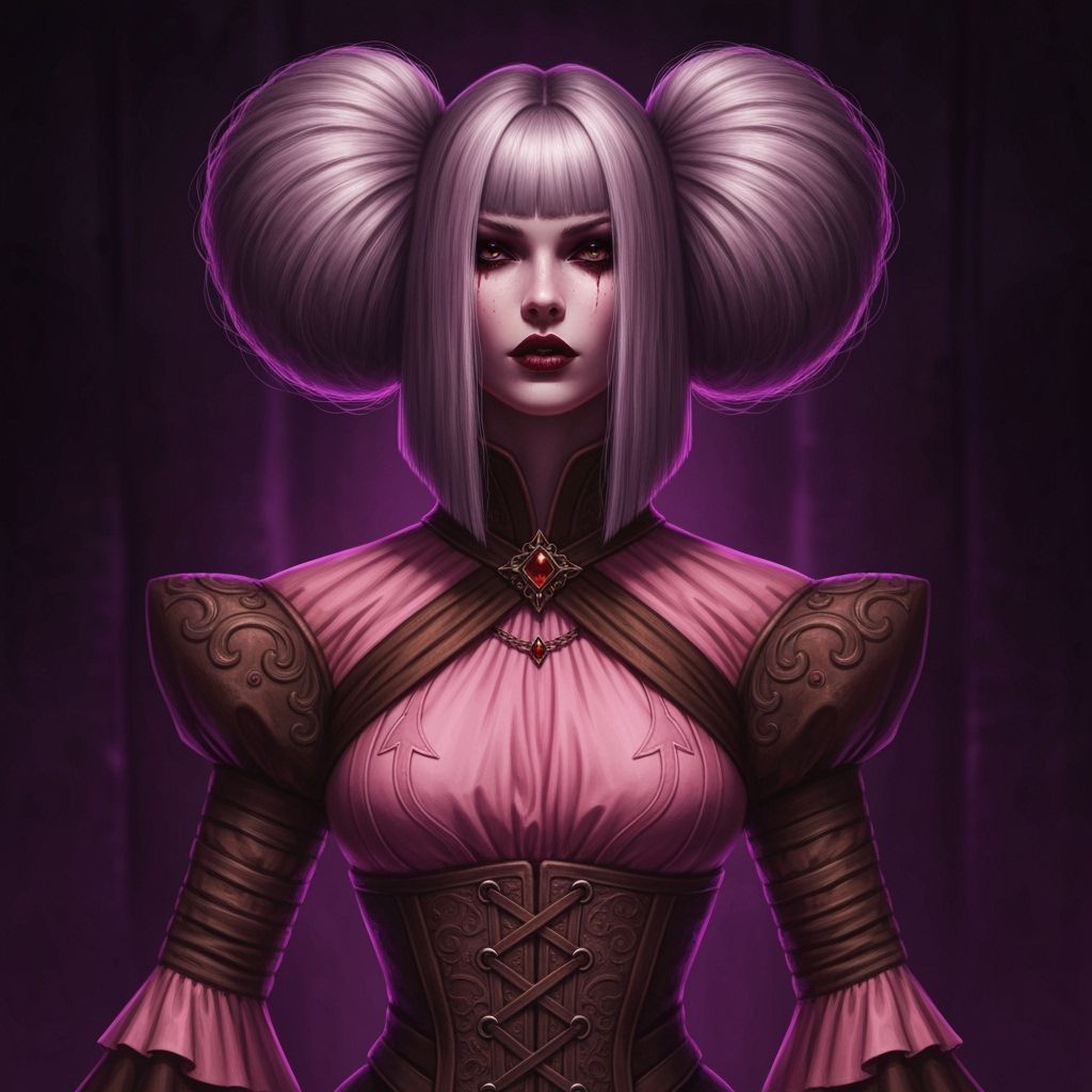 A striking woman with voluminous, textured hair wears ornate pink and brown Gothic clothing. Dramatic chiaroscuro lighting highlights rich textures in a dark fantasy concept art style.