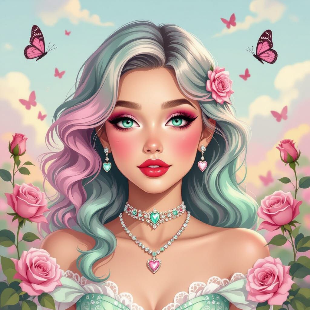 This image shows a young woman with colorful wavy hair and striking teal eyes, adorned with jewelry. The artwork features blooming roses and butterflies with gouache and pencil textures in a soft, ethereal style.