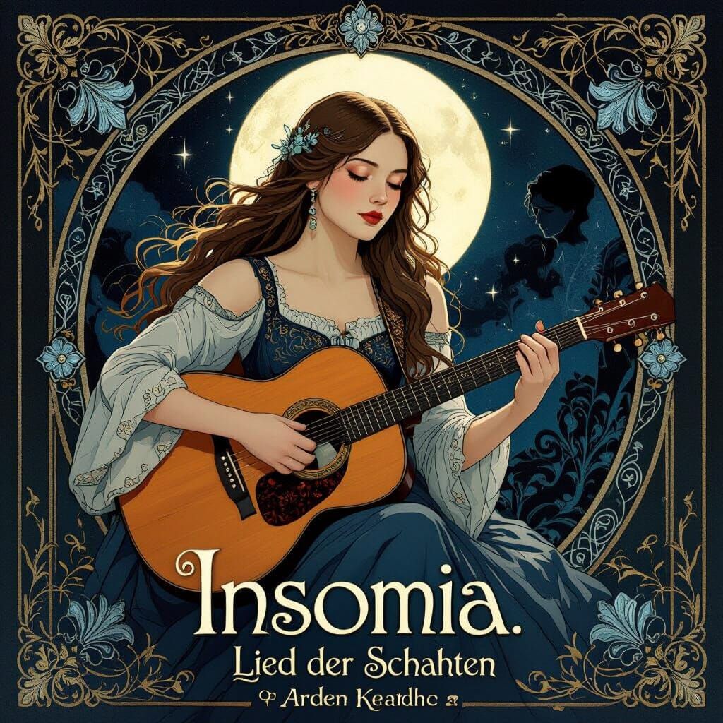 This image shows a woman with flowing hair playing guitar in an Art Nouveau style. Floral ornaments, a Jugendstil frame, and a shadowy figure surround her in deep blues, blacks, silvers and gold.