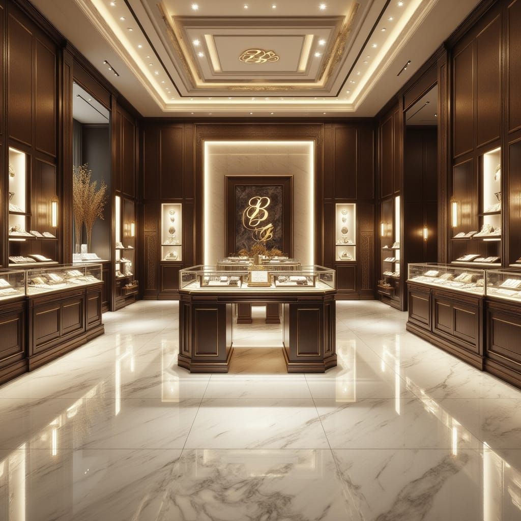 This image shows a luxury jewelry boutique interior with polished marble floors and glass display cases. The aesthetic is defined by soft golden light, reflections, and a muted color palette.