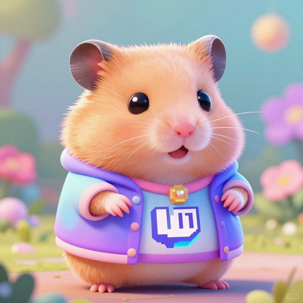 This image shows a fluffy pastel hamster with big eyes, proudly wearing a custom Twitch emote outfit. Rendered in a whimsical digital art style with soft lighting and glowing accents.
