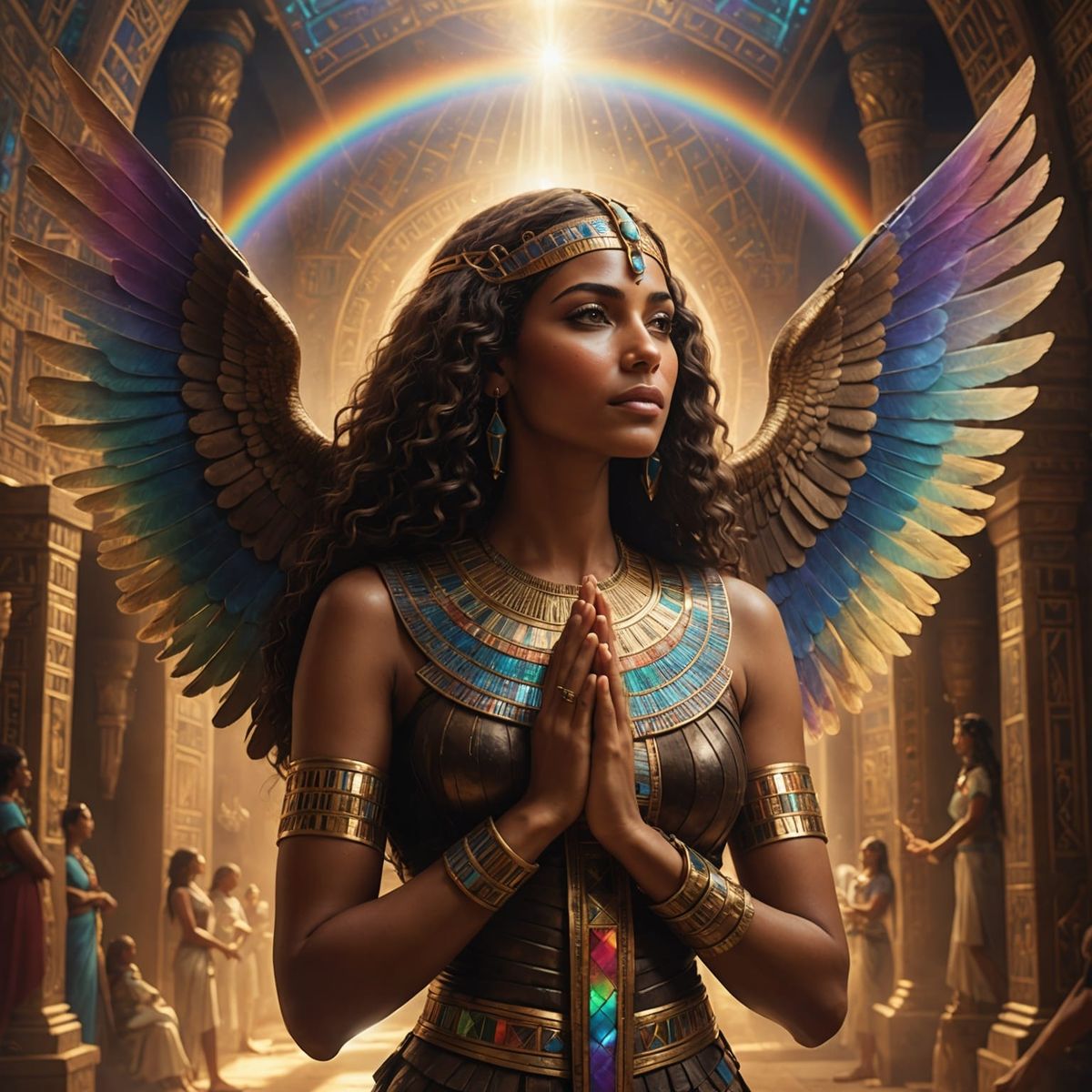 This image depicts an Egyptian woman with magical healing powers emanating from her hands. Rainbow light illuminates her head in this epic, detailed digital painting.
