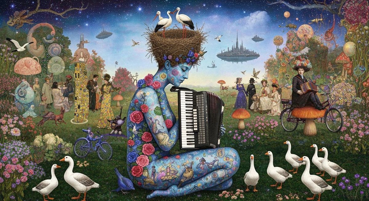 A surreal concept art piece depicting a woman intertwined with cosmic energy, stars, roses, and birds. The image evokes a dreamlike and ethereal utopia with intricate details.