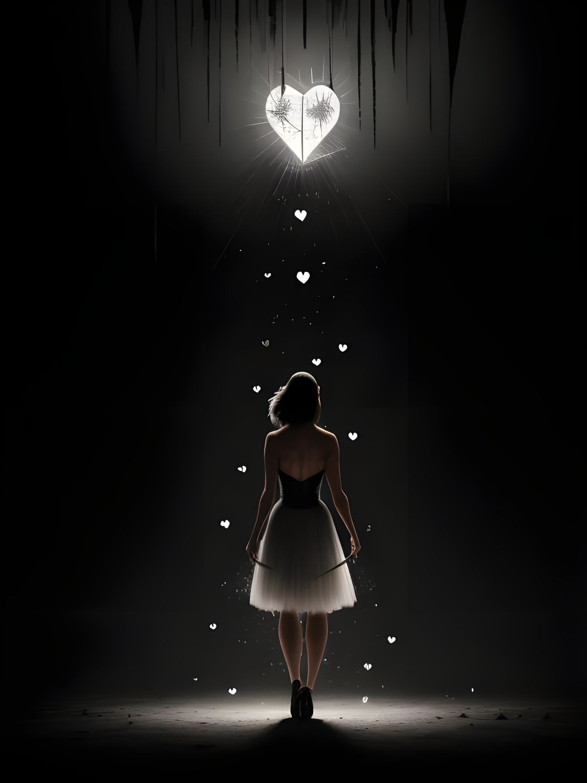 This image visually represents finding hope in difficult times. It illustrates a powerful light emerging from darkness, symbolizing growing strength within a broken heart, rendered with fiery effects.
