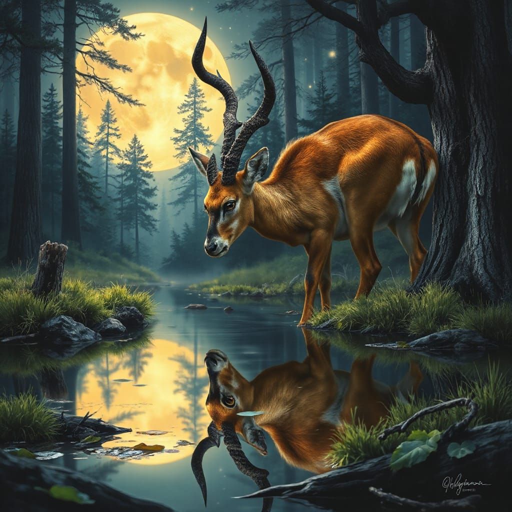 This image shows a blackbuck with tawny fur and striking yellow eyes, its reflection visible in the water as it drinks. The surrounding lush forest is depicted in vibrant detail with a dark fantasy aesthetic.